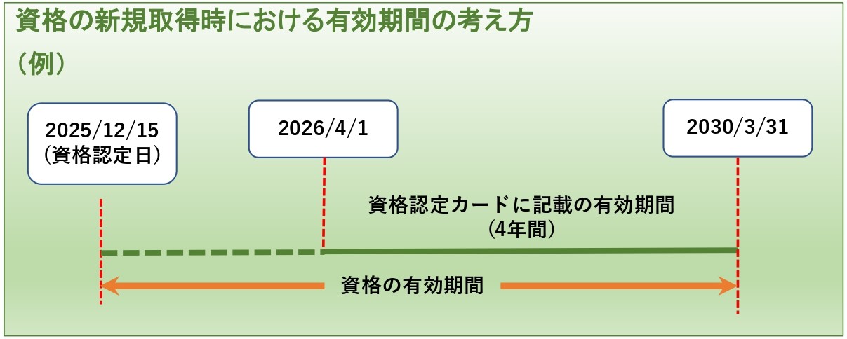 資格の新規取得後に資格の更新研修を受講される場合は、資格の認定カードに記載の有効始期(4月1日または10月1日)以降に受講された研修が更新の対象となりますのでご注意ください。