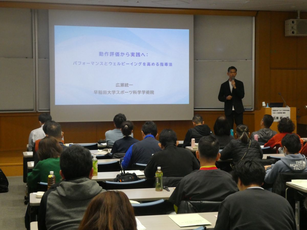 講師には、早稲田大学 スポーツ科学学術院 教授 広瀬 統一(ひろせ のりかず)氏をお迎えし、『動作評価から実践へ~パフォーマンスとウェルビーイングを高める指導法~』をテーマにご指導いただきました。午前はウェルビーイングを支える三本柱や4つの仕組み等が紹介され、指導者とウェルビーイングの関わりについてご講演いただき、午後の実習では動作分析の6つのステージの紹介や、グループ内での観察・課題の抽出・改善方法が実践されました。